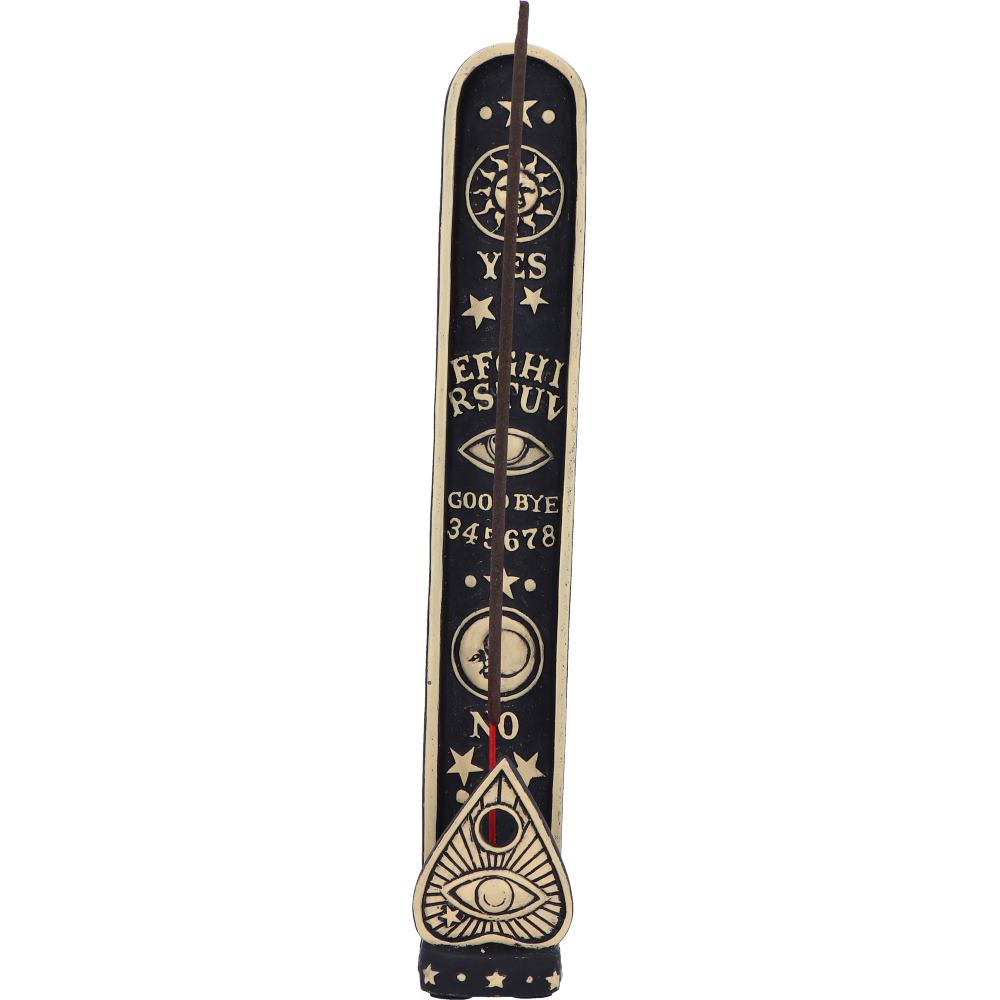 Ponořte se do mystiky s naším držákem na vonné tyčinky Scent of the Spirits z prémiové kolekce Nemesis Now, 23,5 cm vysokým černozlatým mistrovským dílem, které pozvedne vaše duchovní rituály. Tento držák na vonné tyčinky, vyrobený z nejkvalitnější pryskyřice, není jen funkční, ale také uměleckým dílem. Vysoký design zajišťuje, že vonná tyčinka je držena od základny a směřuje nahoru, což vytváří okouzlující vizuální efekt. Horní a střední část zdobí složité detaily připomínající spiritistickou desku, se sluncem, písmeny, číslicemi, okem a lebkou. Ve spodní části je umístěna planchette, která dodává nádech magického věštění. Vysoce kvalitní pryskyřičná konstrukce zaručuje odolnost, zatímco pečlivé ruční malování vyniká složitými detaily.